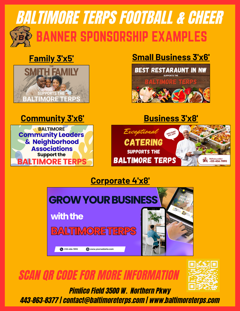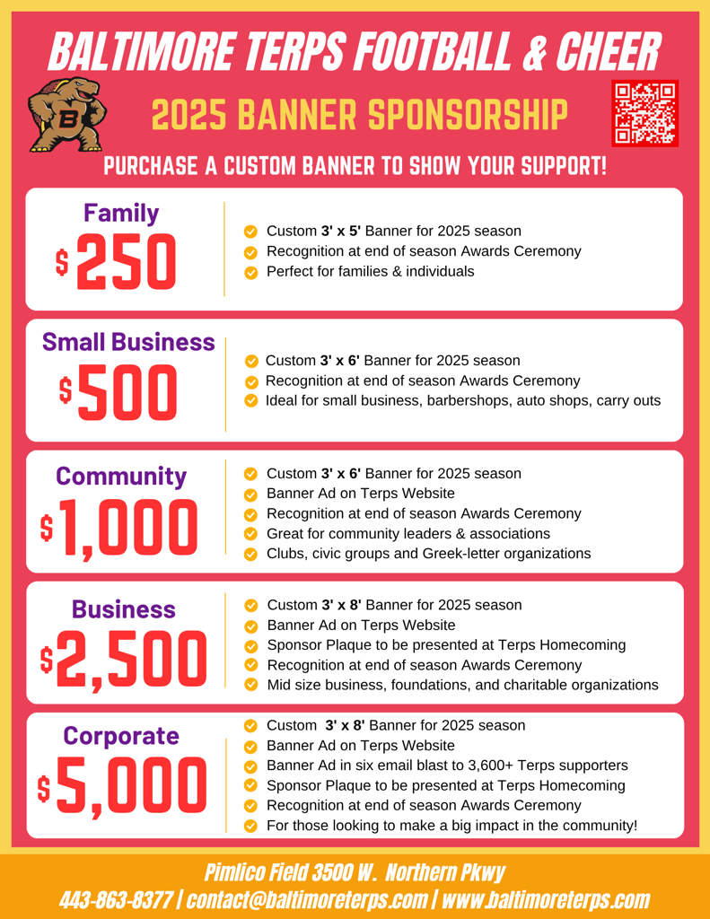 The Banner Fundraiser is an opportunity for local businesses, organizations, and individuals to support the Baltimore Terps Youth Football & Cheer program by purchasing a sponsorship banner. These banners will be prominently displayed at all home games throughout the 2025 season, showcasing your support while gaining exposure in the community.
